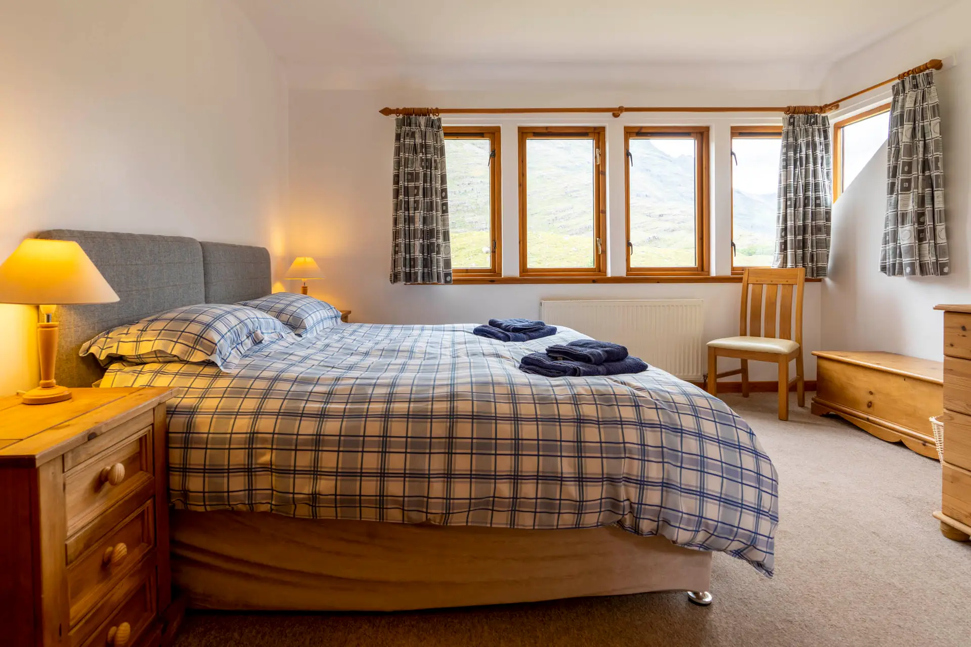 The ground floor comprises a large open plan sitting room/kitchen-dining room, a separate utility room, one king/twin bedroom, shower and downstairs shower room. The kitchen is well equipped with a cooker, fridge, freezer, microwave and dishwasher.